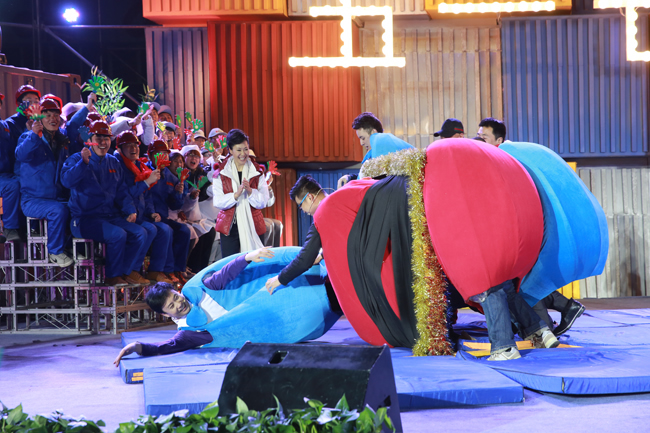 本次《五一七天樂(lè)》節(jié)目的主題是“五一七天樂(lè),勞動(dòng)更快樂(lè)”。節(jié)目在獨(dú)具勞動(dòng)特色的開(kāi)場(chǎng)舞《最炫民族風(fēng)》中拉開(kāi)演出序幕,于文華、管彤推著小推車(chē)出場(chǎng),車(chē)上的大箱子引起了觀眾們的好奇。正當(dāng)觀眾遺憾和猜測(cè)禮物是什么的時(shí)候,老畢出奇意外地從箱子里出來(lái),這份始料未及的“大禮”頓時(shí)引起了現(xiàn)場(chǎng)觀眾一陣歡呼。隨后其他嘉賓分別騎玩具小車(chē)登臺(tái),《五一七天樂(lè)》節(jié)目開(kāi)始。節(jié)目以比賽的形式進(jìn)行,眾位嘉賓分成“紅薯”和“拔絲”倆隊(duì),現(xiàn)場(chǎng)比拼才藝。