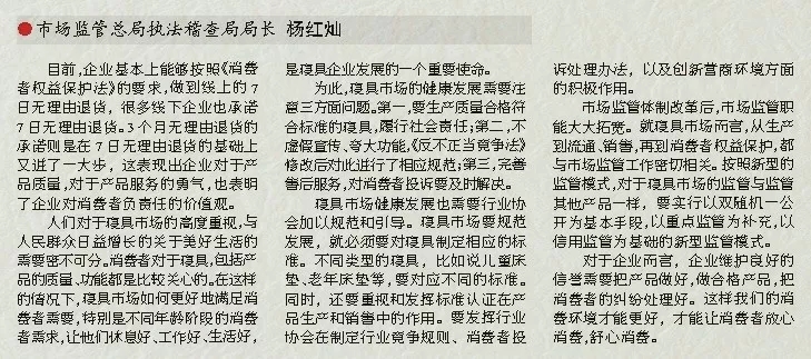 為此,寢具市場的健康發(fā)展需要注意三方面問題。第一,要生產(chǎn)質(zhì)量合格符合標(biāo)準(zhǔn)的寢具,履行社會(huì)責(zé)任;第二,不虛假宣傳、夸大功能,《反不正當(dāng)競爭法》修改后對此進(jìn)行了相應(yīng)規(guī)范;第三,完善售后服務(wù),對消費(fèi)者投訴要及時(shí)解決。