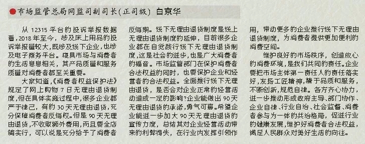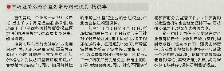 大家知道,《消費(fèi)者權(quán)益保護(hù)法》規(guī)定了網(wǎng)上購物7日無理由退貨制度,但在具體實(shí)施過程中,很多企業(yè)都嚴(yán)于律己,有的30天無理由退貨,充分保障消費(fèi)者反悔權(quán)。但是90天無理由退貨,不收取額外費(fèi)用,而且要全店鋪實(shí)行,可以說是充分給予了消費(fèi)者反悔期。線下無理由退貨制度是線上無理由退貨制度的延伸,目前很多企業(yè)都在自覺踐行線下無理由退貨制度,這是社會(huì)的進(jìn)步,也是廣大消費(fèi)者的福音。市場監(jiān)管部門在保護(hù)消費(fèi)者合法權(quán)益的同時(shí),也要保護(hù)企業(yè)和經(jīng)營者的合法權(quán)益。全面推行線下無理由退貨,是否會(huì)對企業(yè)正常的經(jīng)營活動(dòng)造成一定的影響?企業(yè)能做出90天無理由退貨的承諾,勇氣可嘉。希望企業(yè)能進(jìn)一步加大90天無理由退貨的宣傳力度,總結(jié)其對企業(yè)經(jīng)營活動(dòng)帶來的利弊得失,在行業(yè)內(nèi)發(fā)揮引領(lǐng)作用,帶動(dòng)更多的企業(yè)推行線下無理由退貨制度,為消費(fèi)者提供更加便利的消費(fèi)空間。
