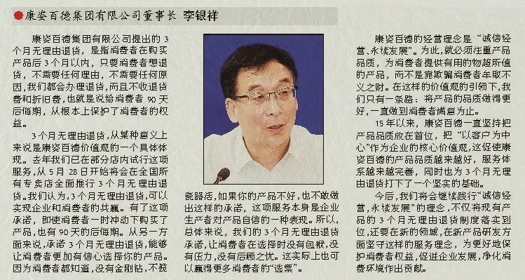 誠信贏天下。在當(dāng)今的誠信經(jīng)濟(jì)時(shí)代,創(chuàng)新、創(chuàng)意、差異化是每一個(gè)企業(yè)追求的情懷??底税俚鹿咎岢龅?個(gè)月無理由退貨制度,反映了他們以消費(fèi)者為本的精神,真誠希望他們能夠履行這項(xiàng)莊嚴(yán)的承諾,希望李銀祥董事長做一位創(chuàng)造價(jià)值的企業(yè)家,弘揚(yáng)企業(yè)家的創(chuàng)新精神、工匠精神和敬業(yè)精神。真正的企業(yè)家應(yīng)以家國情懷、以民族興旺為己任,以時(shí)代擔(dān)當(dāng)和奉獻(xiàn)為最大追求,以滿足人民、滿足社會(huì)對行業(yè)、對產(chǎn)品最大的價(jià)值取向?yàn)槟繕?biāo)。