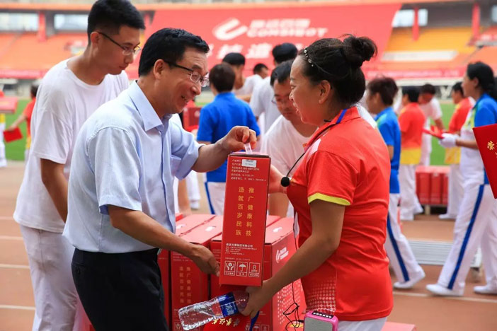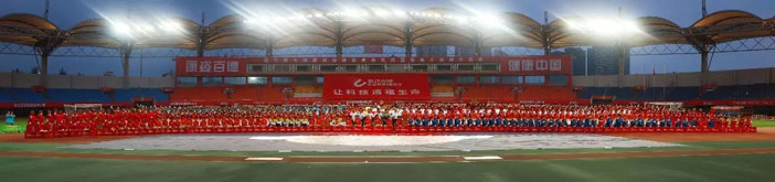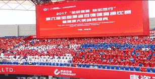 伴隨著優(yōu)美激昂的《走向復(fù)興》音樂,一幅寫有“讓科技造福生命”、面積為608平方米的巨型紅旗步入賽場。康姿百德91名工作人員共舉旗幟,整齊自如地緩緩前行,給人以極大的視覺沖擊!