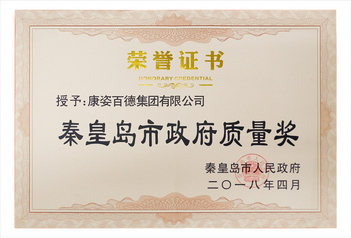 “秦皇島市政府質(zhì)量獎(jiǎng)”證書