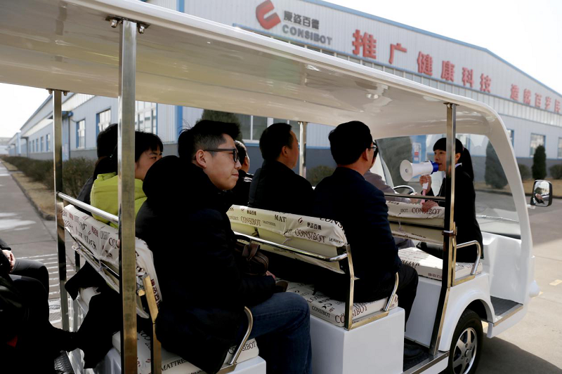 到訪嘉賓乘坐參觀車參觀康姿百德制造中心生產(chǎn)線