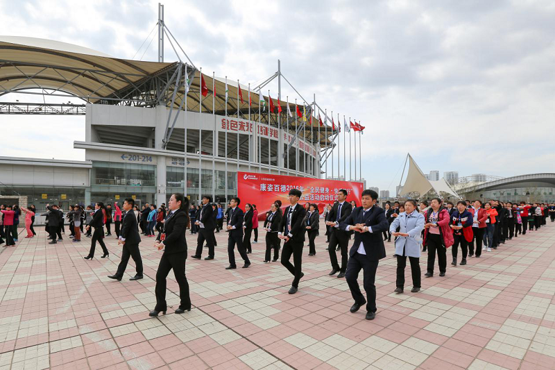 2016年4月2日,康姿百德“全民健身·快樂同行”大型公益活動暨康姿百德第五套健身操推廣啟動儀式在秦皇島市奧體中心正式啟動。來自全國近千名康姿百德各級經(jīng)銷商代表和優(yōu)秀員工代表參加了啟動儀式。