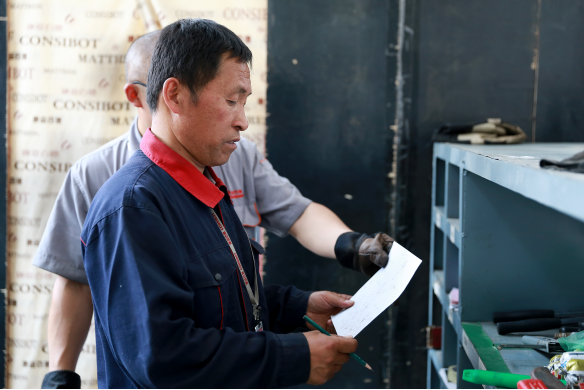 馮國成和同事研究組裝車間頂升設(shè)備技術(shù)革新