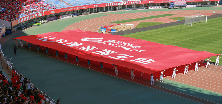 大賽初始,伴隨著激動人心的音樂, 一幅608平方米的巨型康姿百德紅旗步入賽場,康姿百德91名工作人員共舉旗幟,整齊自如地緩緩前行,給人以極大的視覺沖擊。