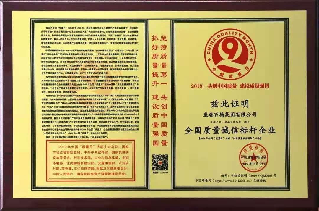康姿百德連續(xù)多年榮獲 “全國(guó)質(zhì)量誠(chéng)信標(biāo)桿企業(yè)”