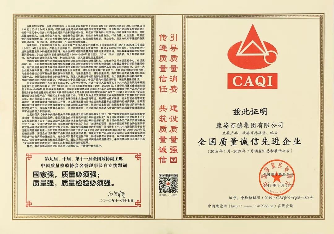 康姿百德產(chǎn)品被評(píng)為“全國(guó)質(zhì)量誠(chéng)信先進(jìn)企業(yè)”