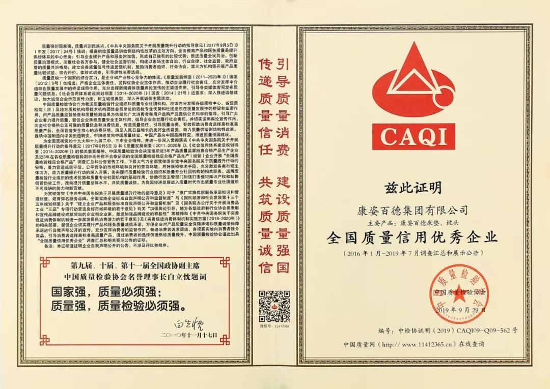 在國(guó)家市場(chǎng)監(jiān)督管理總局聯(lián)合中共中央宣傳部、國(guó)家發(fā)展和改革委員會(huì)等14個(gè)部門部署開(kāi)展的2019年“質(zhì)量月”活動(dòng)中,康姿百德再獲權(quán)威機(jī)構(gòu)的肯定與認(rèn)可,被授予2019年度“全國(guó)質(zhì)量誠(chéng)信標(biāo)桿企業(yè)”。