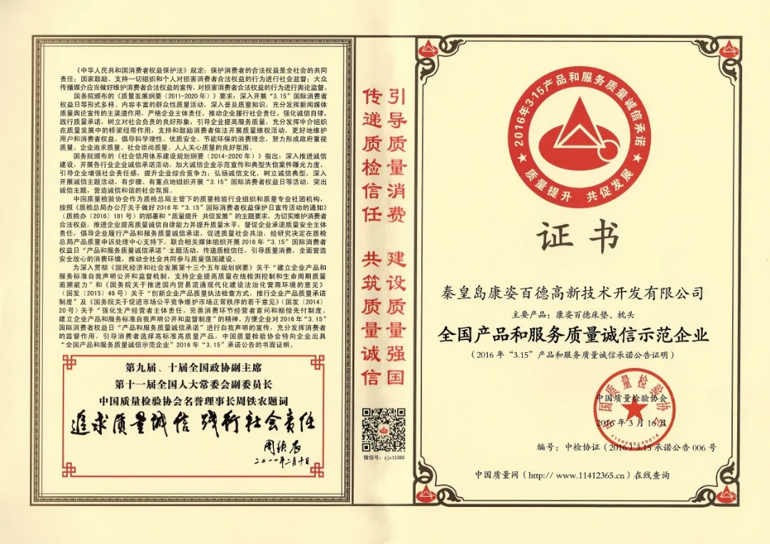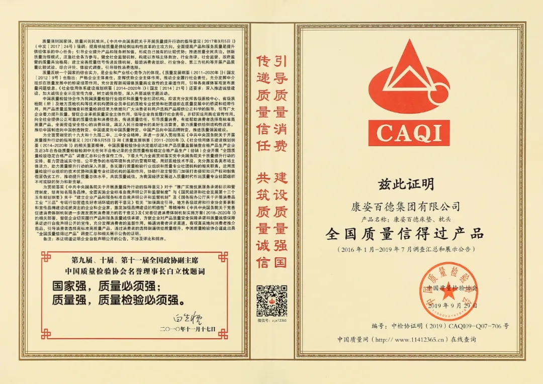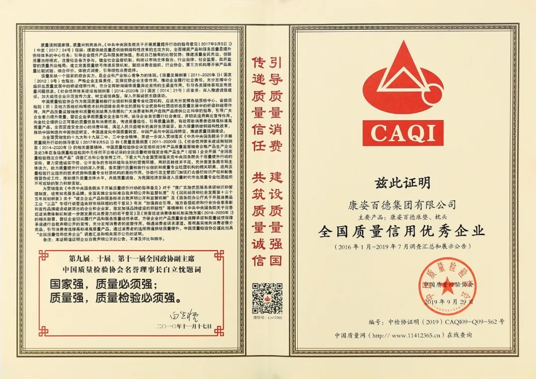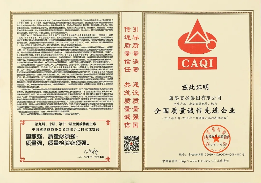 在李銀祥董事長的帶領(lǐng)下,康姿百德始終堅持誠信經(jīng)營,并先后榮獲了”全國產(chǎn)品和服務質(zhì)量誠信示范企業(yè)“、“全國質(zhì)量信用優(yōu)秀企業(yè)”、”全國質(zhì)量誠信先進企業(yè)”、“全國質(zhì)量信得過產(chǎn)品”等多項榮譽。