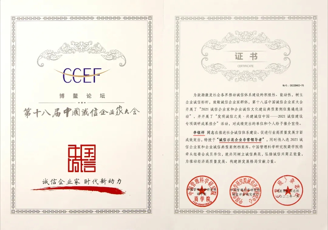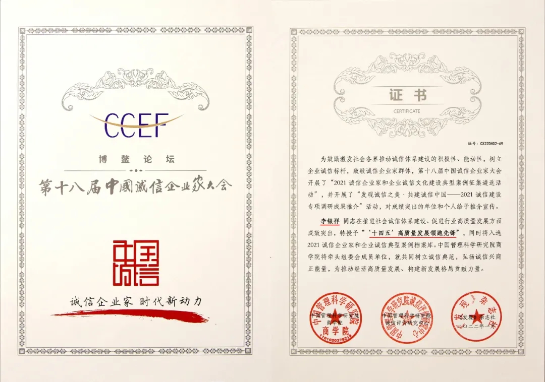 中國誠信企業(yè)家大會期間,經(jīng)中國管理科學研究院商學院學術(shù)委員會評定,李銀祥董事長還被聘任為中國管理科學研究院商學院“十四五”規(guī)劃編制專家組成員。