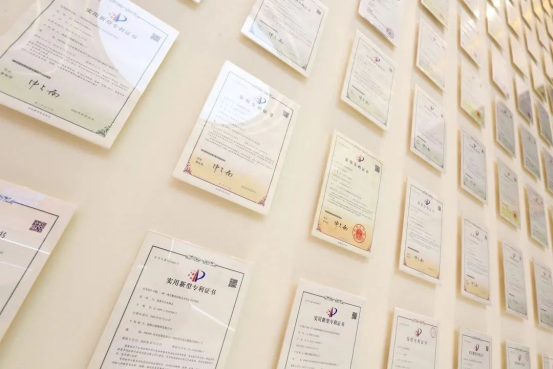 整面的專利墻,收錄了李銀祥董事長領導的旗下集團百余項專利。這面墻沒有過多的裝飾,卻足以彰顯李銀祥董事長對科研創(chuàng)新的重視和投入??底税俚略诶钽y祥董事長的領導下,自成立以來就高度重視在科研方面的投入,不斷加大科研投入力度,致力于提升產品和服務質量。