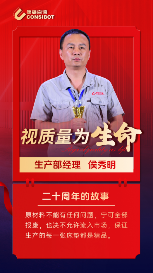 今年是康姿百德集團成立20周年。在20年的發(fā)展歷程中,涌現(xiàn)出一大批在生產(chǎn)發(fā)展、原料采購、質(zhì)量管控、經(jīng)營管理、售后服務等各個領域立足崗位、奉獻建功的優(yōu)秀代表。讓我們一起看看這些榜樣故事。本期帶你走進康姿百德生產(chǎn)部經(jīng)理侯秀明。