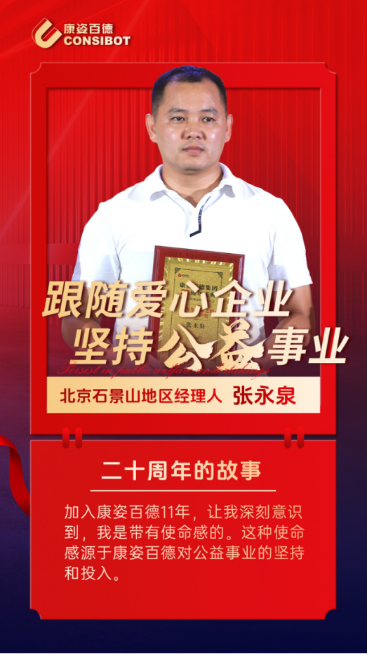他常說“成功的關(guān)鍵在于不斷沉淀與堅(jiān)持”。自加入康姿百德11年來,他以飽滿的熱情和堅(jiān)韌不拔的毅力,不斷提升服務(wù)質(zhì)量,努力為客戶創(chuàng)造更大的價(jià)值。懷揣著對公益事業(yè)的熱情和無盡的動力,堅(jiān)持公益,默默貢獻(xiàn)著自己的力量。他就是康姿百德北京石景山地區(qū)經(jīng)理人張永泉。
