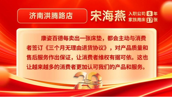 她還說道:“康姿百德還統(tǒng)一制作監(jiān)督舉報(bào)公示牌,張貼在門店內(nèi),主動接受廣大消費(fèi)者的監(jiān)督。這一舉措為消費(fèi)者提供了投訴渠道,讓消費(fèi)者的合法權(quán)益得到保障,這樣消費(fèi)者在購買產(chǎn)品時(shí)更加放心。不僅如此,康姿百德每賣出一張床墊,都會主動與消費(fèi)者簽訂《三個(gè)月無理由退貨協(xié)議》,對產(chǎn)品質(zhì)量和售后服務(wù)作出保證,讓消費(fèi)者維權(quán)有據(jù)可依。這也讓越來越多的消費(fèi)者更加認(rèn)可我們的產(chǎn)品和服務(wù)?!?/span>