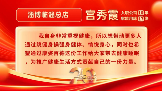 宮秀霞因康姿百德健身操與康姿百德結(jié)緣,入職后,了解到康姿百德是一家有社會責(zé)任感的公司,一直用實(shí)際行動推動著“健康中國”建設(shè)。