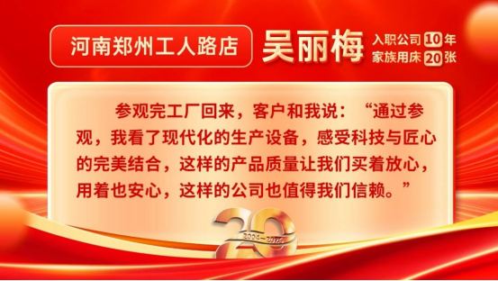 今年是康姿百德集團成立20周年。在20年的發(fā)展歷程中,有這樣一群人,他們在市場經營管理過程中,深刻貫徹以客戶為中心的理念,始終把優(yōu)質的服務融于門店經營的每個環(huán)節(jié),也因此得到了客戶的贊賞和認可。他們就是康姿百德專賣店的員工。本期和您分享的是康姿百德河南地區(qū)和福建地區(qū)專賣店員工代表的故事。