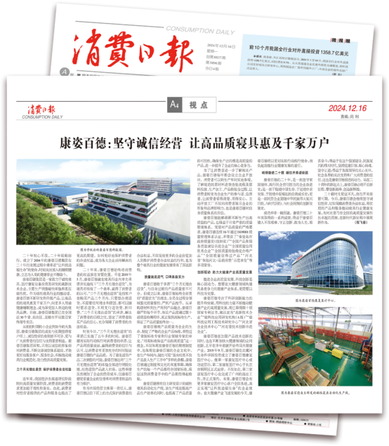 《消費(fèi)日?qǐng)?bào)》由國(guó)務(wù)院國(guó)有資產(chǎn)監(jiān)督管理委員會(huì)舉辦,中國(guó)輕工業(yè)聯(lián)合會(huì)主管主辦,是我國(guó)消費(fèi)領(lǐng)域中一張全國(guó)性、全方位、大容量的綜合性日?qǐng)?bào)。其立足消費(fèi)領(lǐng)域,依托輕工行業(yè),面向城鄉(xiāng)市場(chǎng),最先發(fā)布相關(guān)的專業(yè)權(quán)威信息以及消費(fèi)景氣預(yù)報(bào)。近日,消費(fèi)日?qǐng)?bào)以《康姿百德:堅(jiān)守誠(chéng)信經(jīng)營(yíng) 讓高品質(zhì)寢具惠及千家萬(wàn)戶》為題,對(duì)康姿百德進(jìn)行了專題報(bào)道。