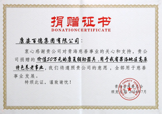 青海省慈善總會為康姿百德頒發(fā)“捐贈證書”
