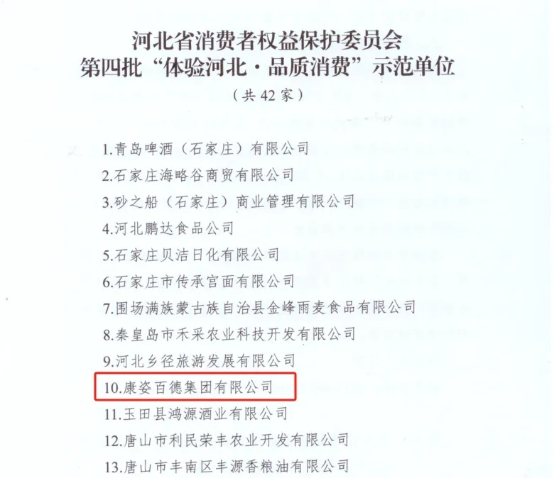 康姿百德集團(tuán)被評為河北省“‘體驗(yàn)河北·品質(zhì)消費(fèi)’示范單位”