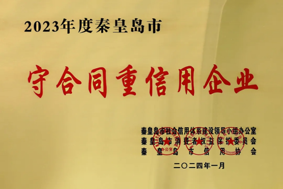 康姿百德集團(tuán)榮獲“秦皇島市守合同重信用企業(yè)”、“秦皇島市信用協(xié)會 第一屆理事會副會長單位”榮譽(yù)稱號