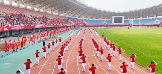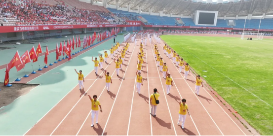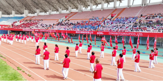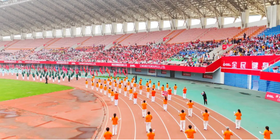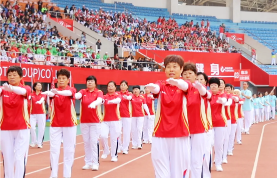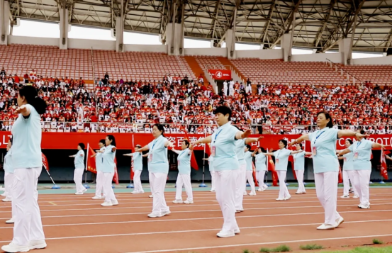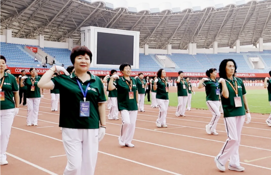 現(xiàn)場82支展演隊伍,浩浩蕩蕩、首尾相連,偌大的體育場瞬時變成一個律動的海洋。參賽隊員各個精神抖擻、熱情高漲,踏著康姿百德健身操音樂節(jié)拍,整齊劃一地舞動起來,贏得了全場觀眾的陣陣掌聲。