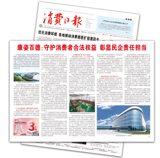 《消費日報》于1985年創(chuàng)刊,由國務院國有資產(chǎn)監(jiān)督管理委員會舉辦,中國輕工業(yè)聯(lián)合會主管主辦。今年3月,消費日報以“守護消費者合法權(quán)益 彰顯民企責任擔當”為題,對康姿百德進行了專版報道。
