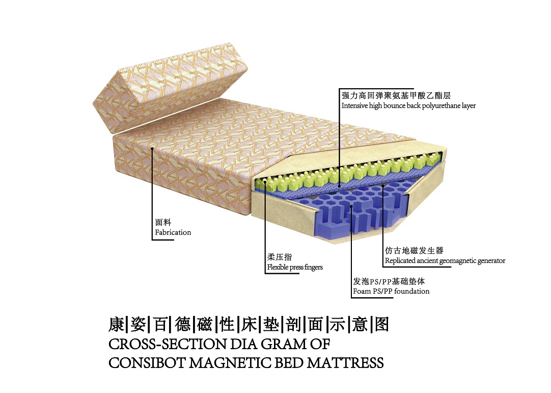 該系統(tǒng)為康姿百德磁性床墊內(nèi)置核心技術(shù)之二,由柔壓指層、強(qiáng)力高回彈聚氨基甲酸乙酯層、發(fā)泡PS/PP基礎(chǔ)墊體等多個(gè)部分組成,有以下特點(diǎn): 1、靜態(tài)被動(dòng)指壓:由多種高分子材料經(jīng)特殊工藝處理而成的乳突狀凸起,可在靜態(tài)狀態(tài)下對(duì)人體產(chǎn)生被動(dòng)指壓的作用。 2、自然通風(fēng)透氣:墊體采用模具成型的乳突狀凸起結(jié)構(gòu)和蜂窩狀自然通氣孔道設(shè)計(jì),保持床體干爽舒適。 3、符合人體工效學(xué)原理:無(wú)簧彈性支撐系統(tǒng)墊體能順應(yīng)人體自然生理曲線,腰部得到承托,臀部適度下陷,脊椎保持正常的生理彎曲,使身體各部位處于放松狀態(tài),獲得健康舒適的睡眠體驗(yàn)。